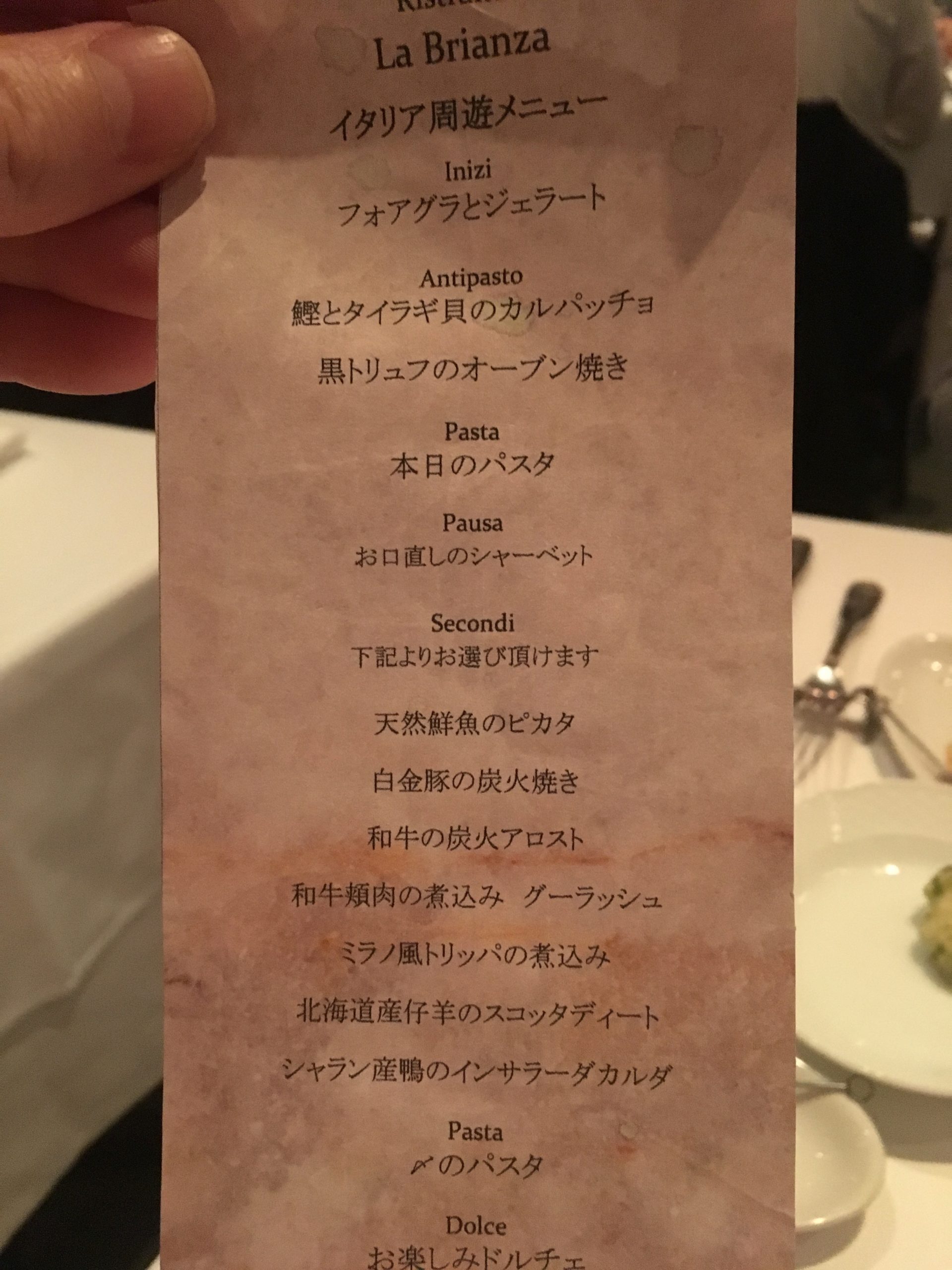 Okuno-san changes the menu seasonality only offering the freshest ingredients. The other night we had a wonderful La Brianza autumn course menu that included oysters, saba fish over muscles, a tasting of foie gras, perfectly cooked Kobe beef, handcrafted cheese over sweet red tomatoes, and gratin with truffles. Of course there is a wide selection of pastas, risotto and gnocchi on the menu as well.”